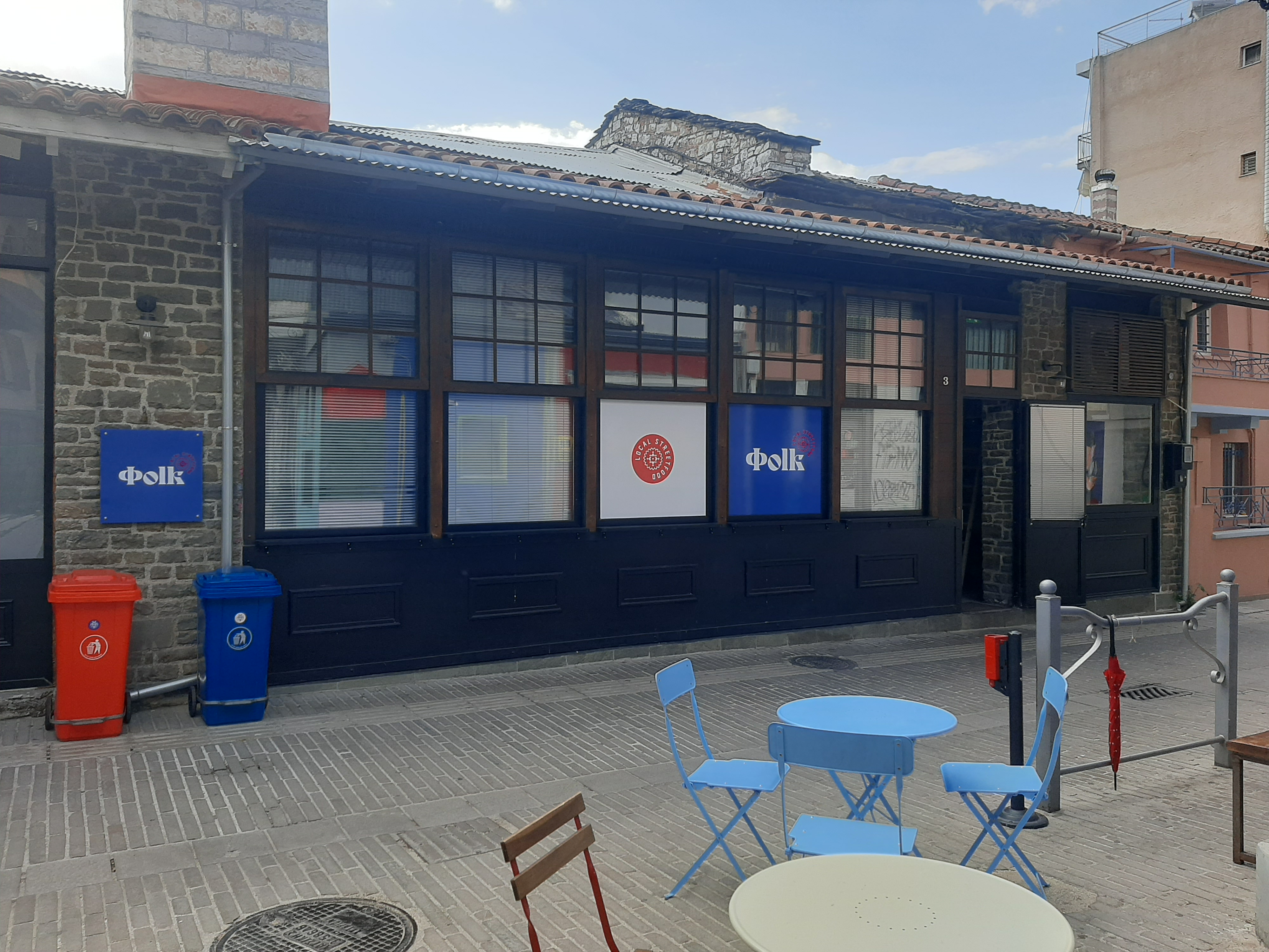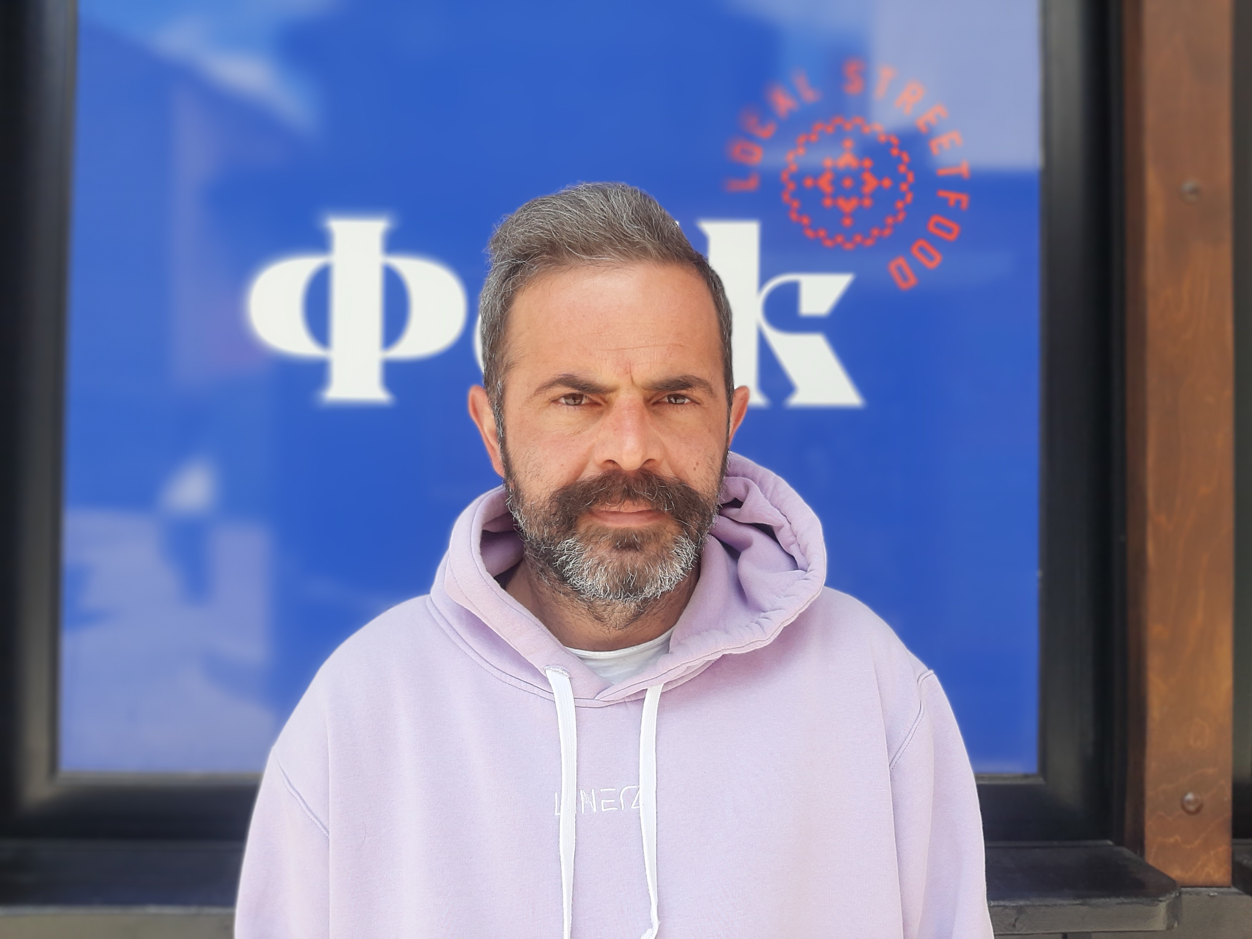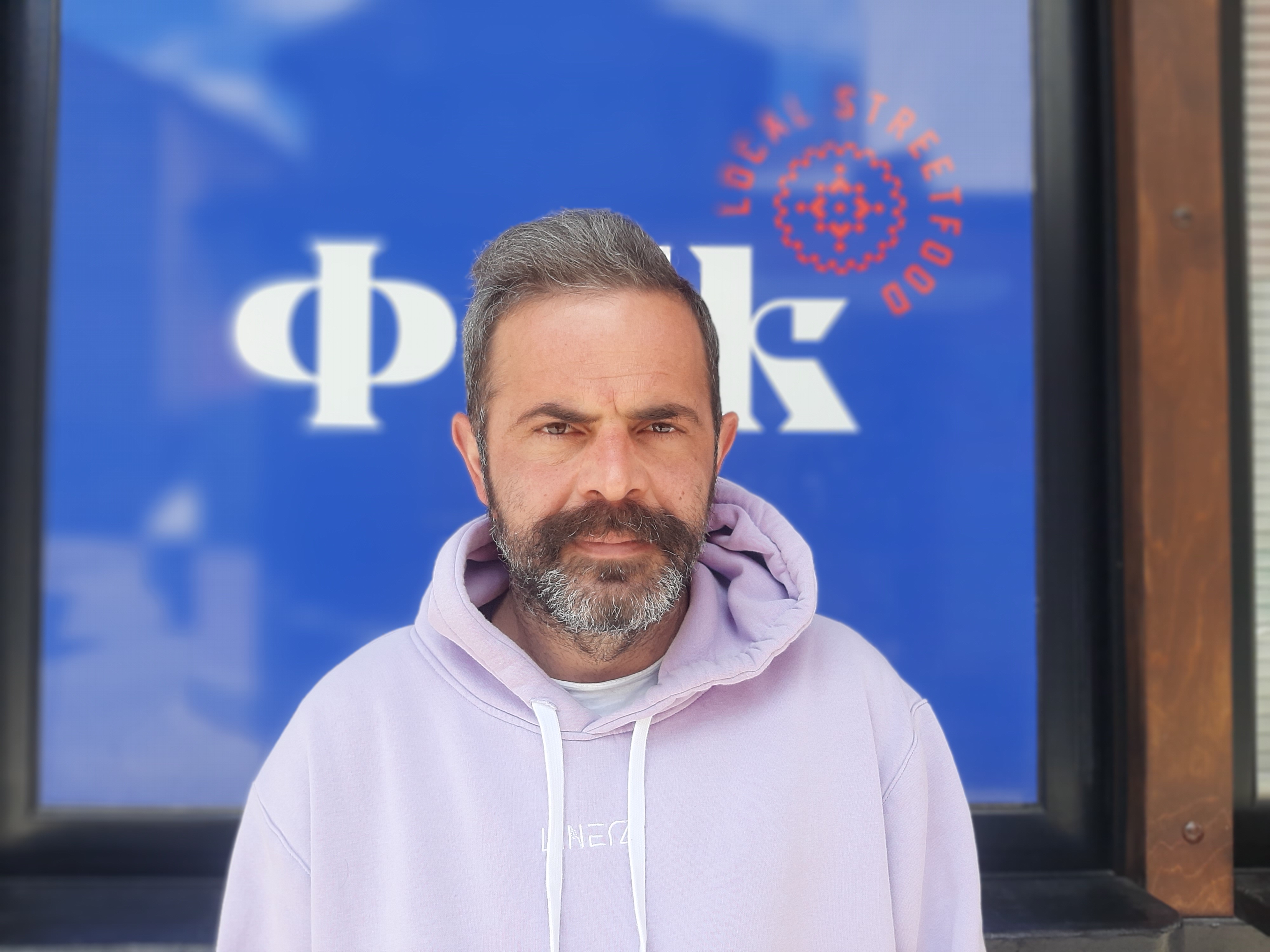 Το Φolk δημιουργήθηκε εδώ και δύο χρόνια, 8 Μαΐου το 2020 –τώρα σε λίγο καιρό έχουμε γενέθλια 2 χρόνων– από εμένα και τον ξάδερφό μου –παύλα φίλο μου, παύλα αδερφό, μου παύλα πολλά, ρε παιδί μου– τον Θέμη. Δημιουργήθηκε με ένα σκοπό ο οποίος… Μ’ έναν κοινό στόχο πάλι, την ανάδειξη των ντόπιων προϊόντων. Σε έχω ζαλίσει λίγο με τα ντόπια προϊόντα, αλλά εκεί πιστεύω ότι είναι η βάση, αυτός πιστεύω ότι είναι ο στόχος μου: να αναδείξω τα ντόπια προϊόντα. Λοιπόν, δημιουργήθηκε το κατάστημα Φolk ως street food. Όταν εννοώ «street food», είναι ταχυφαγείο; Δεν ξέρω αν μπορώ να το πω ταχυφαγείο, γιατί δεν παίρνεις ένα φαγητό στο δίλεπτο ούτε παίρνεις ένα φαγητό στο τρίλεπτο, μπορεί να περιμένεις και ένα δεκάλεπτο να το πάρεις, δεκαπεντάλεπτο κι εικοσάλεπτο και τριαντάλεπτο, αναλόγως τον κόσμο που έχει. Εμείς επιλέξαμε να κάνουμε ένα street food, με την προϋπόθεση να αναδείξουμε… με την προϋπόθεση να έχουμε την άμεση επαφή με τον κόσμο και εγώ και ο ξάδερφός μου, ούτως ώστε μελλοντικά να κάνουμε κάτι πιο σταθερό, πιο εστιατοριακό με βάση τα τοπικά προϊόντα. Εδώ χρησιμοποιούμε μόνο τοπικά προϊόντα, από το κρέας μέχρι τα αυγά, μέχρι τη μαναβική, μέχρι… Όλα τα πράγματα είναι ντόπια. Λαϊκή πηγαίνει ο ξάδερφός μου. Δηλαδή πηγαίνει ο ξάδερφός μου κάθε πρωί στη λαϊκή, είτε εγώ είτε ο ξάδερφός μου θα πάμε στη λαϊκή και θα πάρουμε κάποια πράγματα φρέσκα, ντόπια, για να λειτουργήσει το μαγαζί. Είναι όλα δικά μας από το ψωμί μέχρι τις σάλτσες, είναι όλες δικές μας. Γίνονται απ’ την αρχή όλα. Και γίνονται στο μαγαζάκι αυτό εδώ.