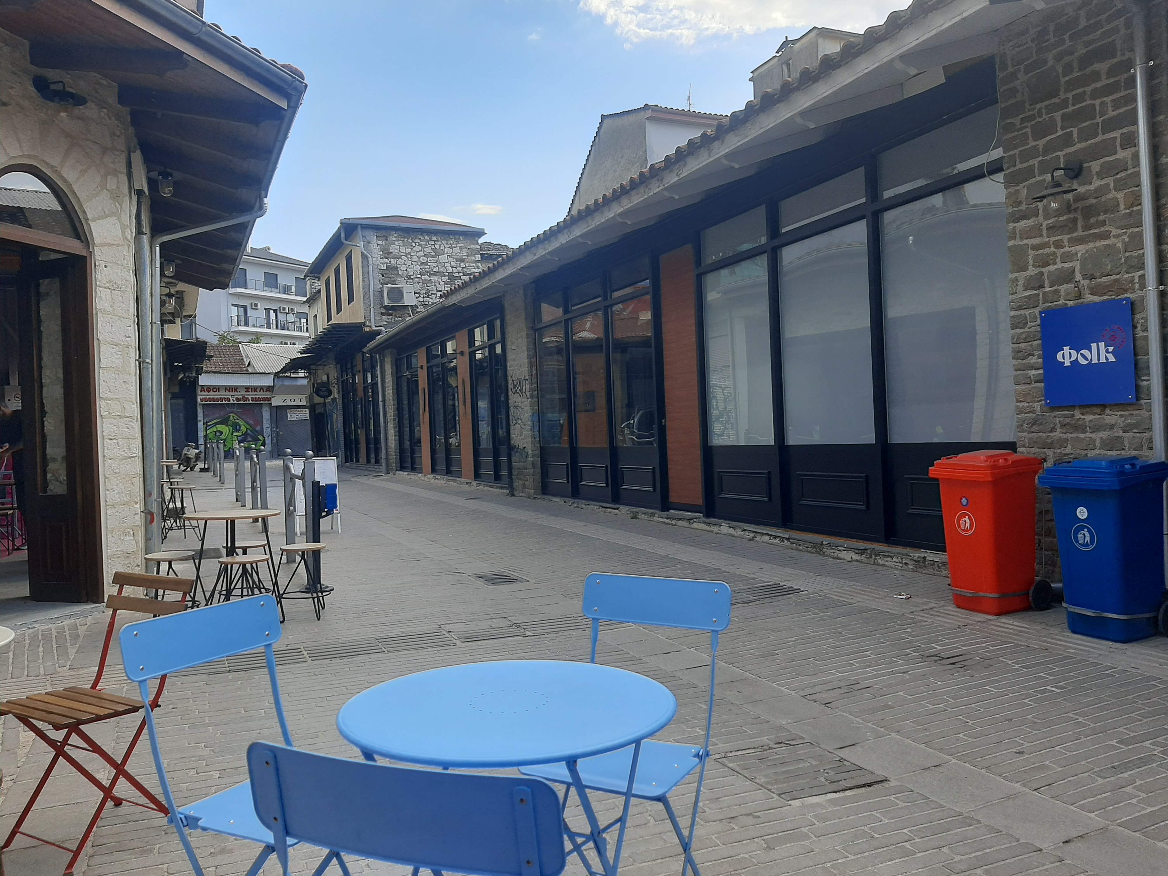 Γιατί επιλέξαμε το ιστορικό κέντρο να δημιουργήσουμε το μαγαζί αυτό; Καλή ερώτηση. Επιλέξαμε και νιώθουμε τυχεροί για το μαγαζί αυτό λόγω… Εμείς όταν πήραμε την απόφαση με τον Θέμη να κάνουμε μαγαζί, ψάχναμε ένα μαγαζάκι, το οποίο να ’ναι καταρχήν μικρό, λειτουργικό, χωρίς πολλά έξοδα, λειτουργικά έξοδα, και ψάχναμε γενικώς, δεν ψάχναμε το ιστορικό κέντρο, ψάχναμε γενικώς. Αυτά που σου είπα πριν, με τα λίγα λειτουργικά έξοδα και τέτοια, δεν υπήρχαν στην πάνω πόλη –πάνω πόλη θεωρώ αγορά και το ένα και τ’ άλλο– υπήρχαν μόνο δω. Ψάχναμε εδώ γύρω-γύρω και σε μια στιγμή… Εγώ λόγω δουλειάς είχα σχέσεις και έχω σχέσεις με τη Ράνια, την Ράνια με τα μαχαίρια την Πιτένη. Και έρχομαι και της λέω: «Ρε Ράνια, θέλω να ανοίξω ένα μαγαζί». Και μου λέει: «Εδώ δίπλα σε μένα». «Πω», λέω, «εντάξει». Ουσιαστικά μεγάλο ρόλο στο μαγαζί αυτό που ήρθαμε παίζει, έπαιξε η Ράνια. Η Ράνια είναι γνωστή ως Τέλης Πιτένης με μαχαίρια, έτσι; Για να σου δώσω να καταλάβεις. Και από κείνη τη στιγμή και μετά την ευγνωμονώ ακόμη και τώρα που είμαστε εδώ, γιατί μας άνοιξε πόρτες. Θεωρούμε τη Ράνια τώρα ως οικογένεια. Φαντάσου δηλαδή την έχουμε τη Ράνια ως αδερφή και εγώ και ο Θέμης κι ως… Πώς να σου πω; Και τη Ράνια και τον άντρα της, τον Βαγγέλη, και τα παιδιά της, φαντάσου ότι τα ’χουμε ως… Είμαστε ως οικογένεια τώρα, γιατί μας άνοιξαν τα μάτια, ουσιαστικά, να ’ρθουμε σ’ αυτό τον καταπληκτικό τόπο, για να κάνουμε αυτό το μαγαζί που θέλαμε.