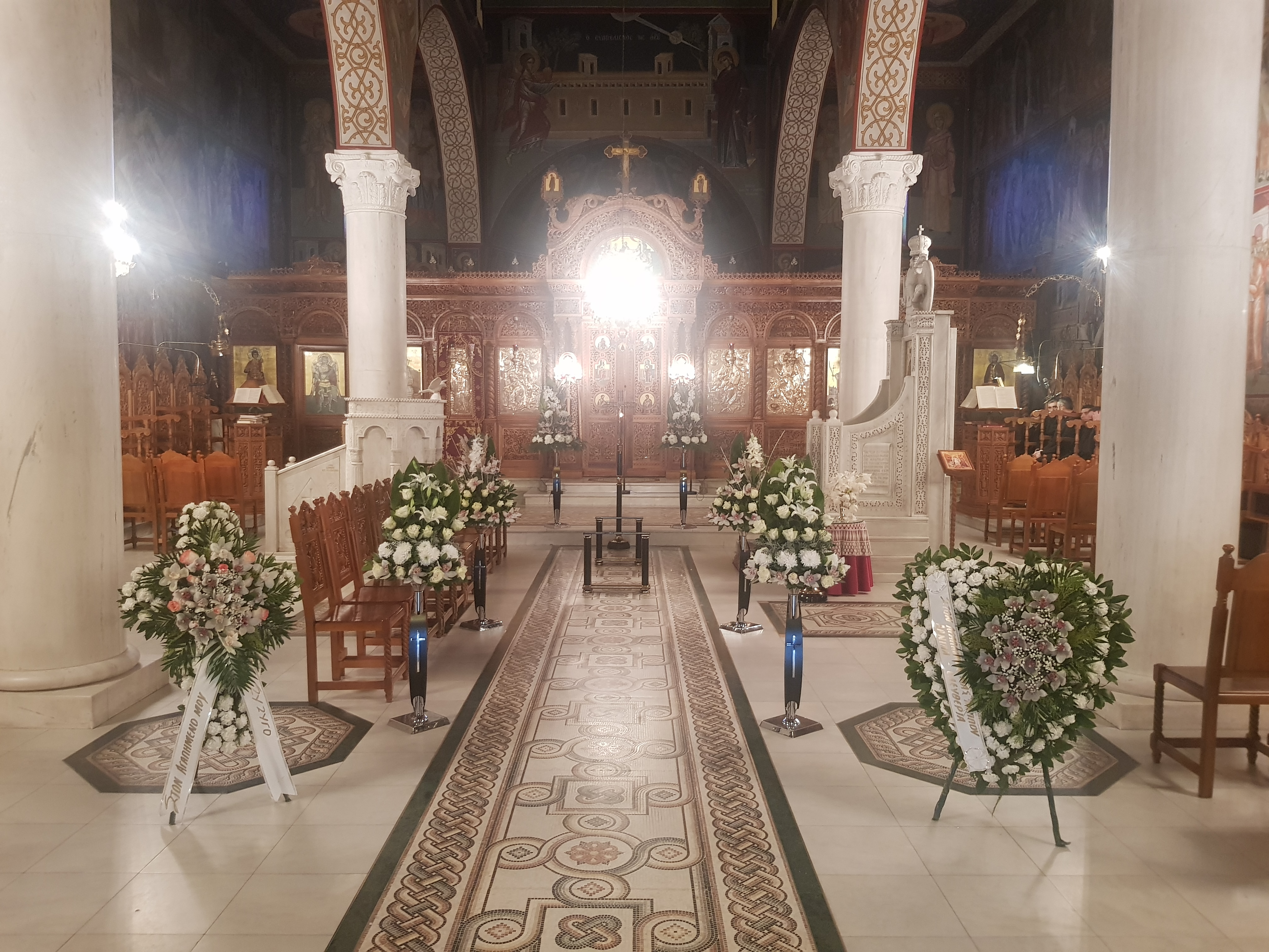 Τα λουλούδια… Έχουμε τα λουλούδια, τα στεφάνια, έχουμε τον στολισμό της εκκλησίας, έχουμε και τον στολισμό του φερέτρου. Σε μια κηδεία μπορούμε, επιθυμία της οικογένειας είναι και δικαίωμα της, να στολίσει την εκκλησία με κάποιες ανθοστήλες, τα στεφάνια πάλι προαιρετικά, όποιος θέλει. Ή κάποιος που δεν μπορεί να παραβρεθεί σε κάποια τελετή, είναι σαν εκπρόσωπος το στεφάνι. Τον εκπροσωπεί δηλαδή το στεφάνι. Και τα λουλούδια πάνω στον νεκρό, πάλι είναι κατά επιλογή του… της οικογένειας, τι λουλούδια θέλουν να μπούνε πάνω στο νεκρό. Μπορεί ο συγχωρεμένος να αγαπούσε τα τριαντάφυλλα ή δεν ξέρω τι και αυτήν την επιθυμία του, η οικογένεια να την κάνει πραγματικότητα.