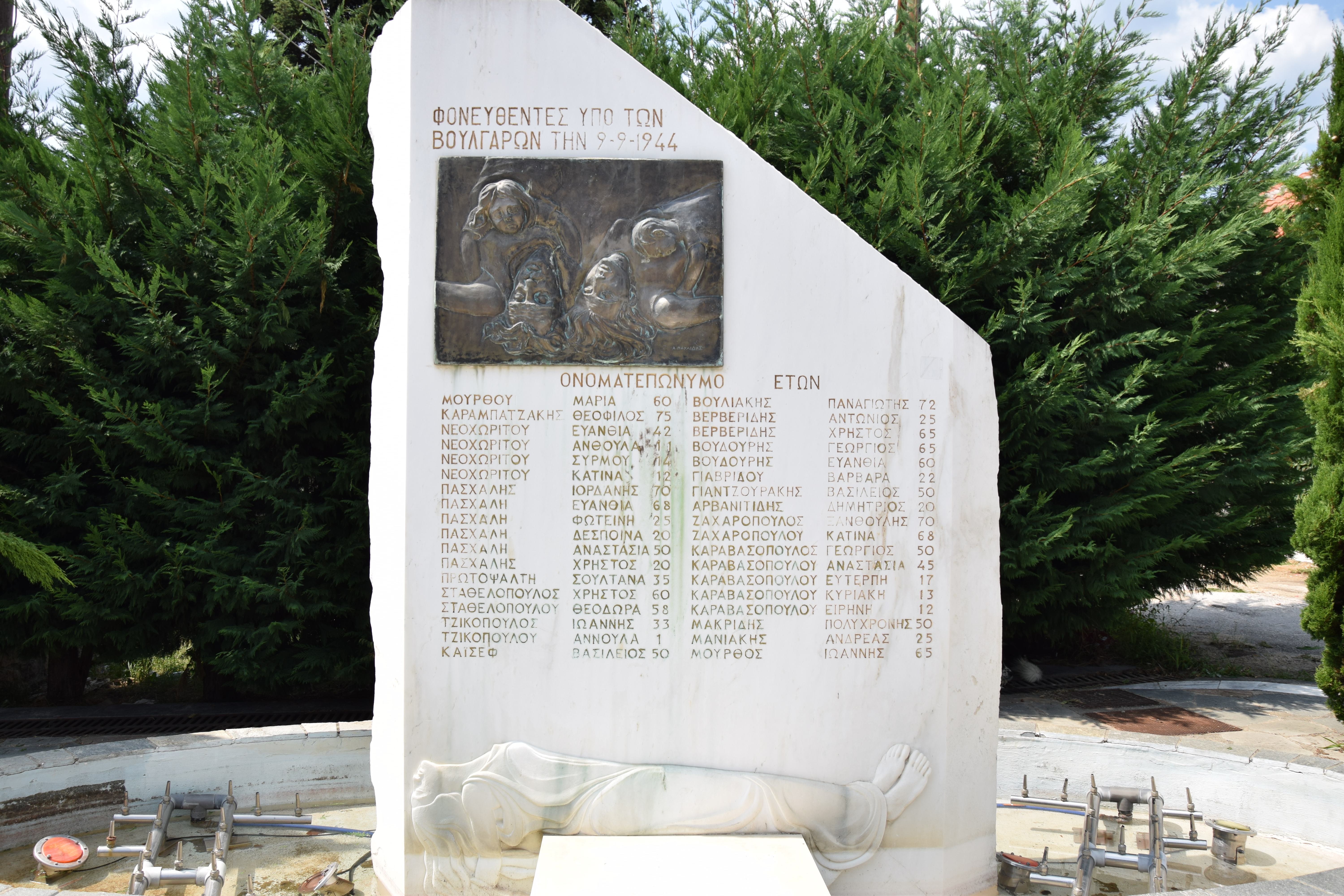 Μόλις ξημέρωσε, δεν ξημέρωνε; Ήτανε ακόμα. Ακούμε όπλα! Άρχισε το μπαμ μπουμ! «Ωχ!» λέει ο παππούς ο Πολυχρόνης, ο μπαμπάς μου. Λέει: «Φωτεινή, πάει! Τώρα είμαστε. Πόλεμος. Κατέβηκαν. Να ξέρεις» λέει «θα γίνει μακελειό!» Κατεβαίνουμε όπως ήμασταν, μωρά. Είχαμε ένα της θείας Αγγελικής, ένα κοριτσάκι. Ήτανε δυόμισι χρονών. Κι όλοι κατεβήκαμε και μπήκαμε –εμείς τότε ήταν παλιά τα σπίτια, είχε χαγιάτι κι είχε αχούρια τα λέγαμε, που βάζαμε τα ζώα– και πήγαμε και κρυφτήκαμε εκεί. Όλη η οικογένεια! Λέει: «Τώρα θα κρυφτούμε εδώ και, άμα δούμε ότι θα τους βγάλουν τους Βουλγάρους και θα φύγουν κάτω από το σπίτι, να πούμε, να βγούμε τότε, να βγούμε στο βουνό να κρυφτούμε». Και κατεβήκαμε, καθόμαστε τώρα εκεί. Ο μπαμπάς μου ήταν πιο μεγάλος. Έβγαινε λίγο, αφουγκραζότανε έξω. Κι έλεγε: «Άμα φύγουν οι Βουλγάροι να βγούμε, να φύγουμε από εδώ απ' το –είχαμε μια πόρτα από κει μεριά που φεύγαμε από το μπαχτσέ, από κει που είσαστε– από κει να φύγουμε για το βουνό. Να γλιτώσουν τα παιδιά. Να γλιτώσουνε!» Αλλά αυτοί, λέει, οι Βουλγάροι μόλις κατέβηκαν, τους έβγαλαν έξω από το χωριό. Αυτοί που ήτανε πάνω δω στην πλατεία και πιο κάτω, αυτοί μπορούσαν να φύγουν. Γιατί τους έβγαλαν τους Βουλγάρους, τους έφεραν. Αλλά εμάς σ' εκείνη την γειτονιά ήτανε ένας –ούτε τον ξέρω τώρα, δεν θα τον πω– κατέβηκε από κάτω από του Καρφόγλου από κει και τους έκοψε τους Βουλγάρους. Πήρε το bren. Και ξαναγύρισαν πίσω οι Βουλγάροι. Σου λέει: «Μας έκαναν κι από δω οι αντάρτες». Και ξαναγύρισαν. Και σε λίγο, βγαίνει ο μπαμπάς μου. Πού να βγει ο καημένος; Εκείνος ήταν ο μεγαλύτερος. Εκείνος. Βγαίνει και βλέπει, η αυλή μας γεμίσαμε Βούλγαροι! Εν τω μεταξύ δίπλα είχαμε κι άλλο σπίτι. Σκότωσαν κι εκείνη την γυναίκα. Τη θεία Αναστασία, θυμάμαι. Εκείνηνα την βρήκαμε, πού την βρήκαμε. Τραβήξαμε πολλά. Είναι ιστορία. Και βγήκε, λέει, ο μπαμπάς μου. Μπήκε μέσα. «Τώρα...» Ήρθανε, έψαξαν οι Βουλγάροι, χτυπάν, μας βγάζουν όλους έξω. Μας βγάζουν έξω. Θυμάμαι τώρα, σαν όνειρο τώρα εγώ το θυμάμαι. Εγώ εν τω μεταξύ φορούσα ένα φουστάνι, κόκκινο αλεξίπτωτο! Που έριχναν οι Άγγλοι απάνω. Και με το 'δωσε η θεία η Ζαμπακιά, που ήταν ο γιος της αντάρτης. Και με το 'δωσε και με το 'κανε ένα φουστανάκι. Η μάνα μου μόλις είδε, με είχε μία μπέρτα μπλε, έτσι μαυριδερή, με λέει: «Κορίτσι σκεπάσου! Και άμα σε δούνε οι Βούλγαροι με αυτό το φουστάνι, θα λένε: «Βρε αντάρτη έχετε; Θα σας σκοτώσουνε!» Κι εγώ το καημένο, τι ήμουνα; 7 χρονών; Εκείνο είχα πια. Να μη με δουν οι Βουλγάροι. Βγαίνουμε, που λες. Μας βγάζουν όλο οι Βουλγάροι έξω. Είχαν σκοπό να μας πάρουνε, όλη την οικογένεια, να μας φέρουν εδώ στο σχολείο. Εκεί κοπανούσε. Εκεί όσοι πήγανε, δεν γλιτώσανε. Τους σκοτώσανε όλους. Αλλά εμάς τώρα πώς έγινε, βγήκαμε εκεί στην πόρτα την μεγάλη, τώρα που βγαίνει η θεία Ελένη, που βγαίνουμε. Τότε, ήταν τούρκικα κι είχε πόρτα μεγάλη. Την ανοίξαμε και βγήκαμε εκεί. Και αυτό το θυμάμαι σαν όνειρο. Από κει φωνάζουνε ένας, οι Βούλγαροι, ένας Βούλγαρος και λέει: «А ту́ка (εδώ ακριβώς)!». Ела ту́ка, θα πει «Σκότωσ' τους αυτό που είναι!» Έτσι έγινε. Μόλις άκουσαν ο μπαμπάς μου «Α ту́ка!», σου λέει: «Σκότωσ' τους, μην τους φέρνετε επάνω στο αυτό. Όπως είναι!» Και το θυμάμαι σαν όνειρο, ένας με bren, μεγάλο όπλο. Απ' αυτό το bren που... Κατέβηκε και κατευθείαν είδε τον μπαμπά. Ήταν πιο μεγάλος, πενήντα χρονών. Κατευθείαν σκότωσε εκείνονα! Η μάνα μου, η Φωτεινή, πήγε να τον αγκαλιάσει δήθεν, να τον γ