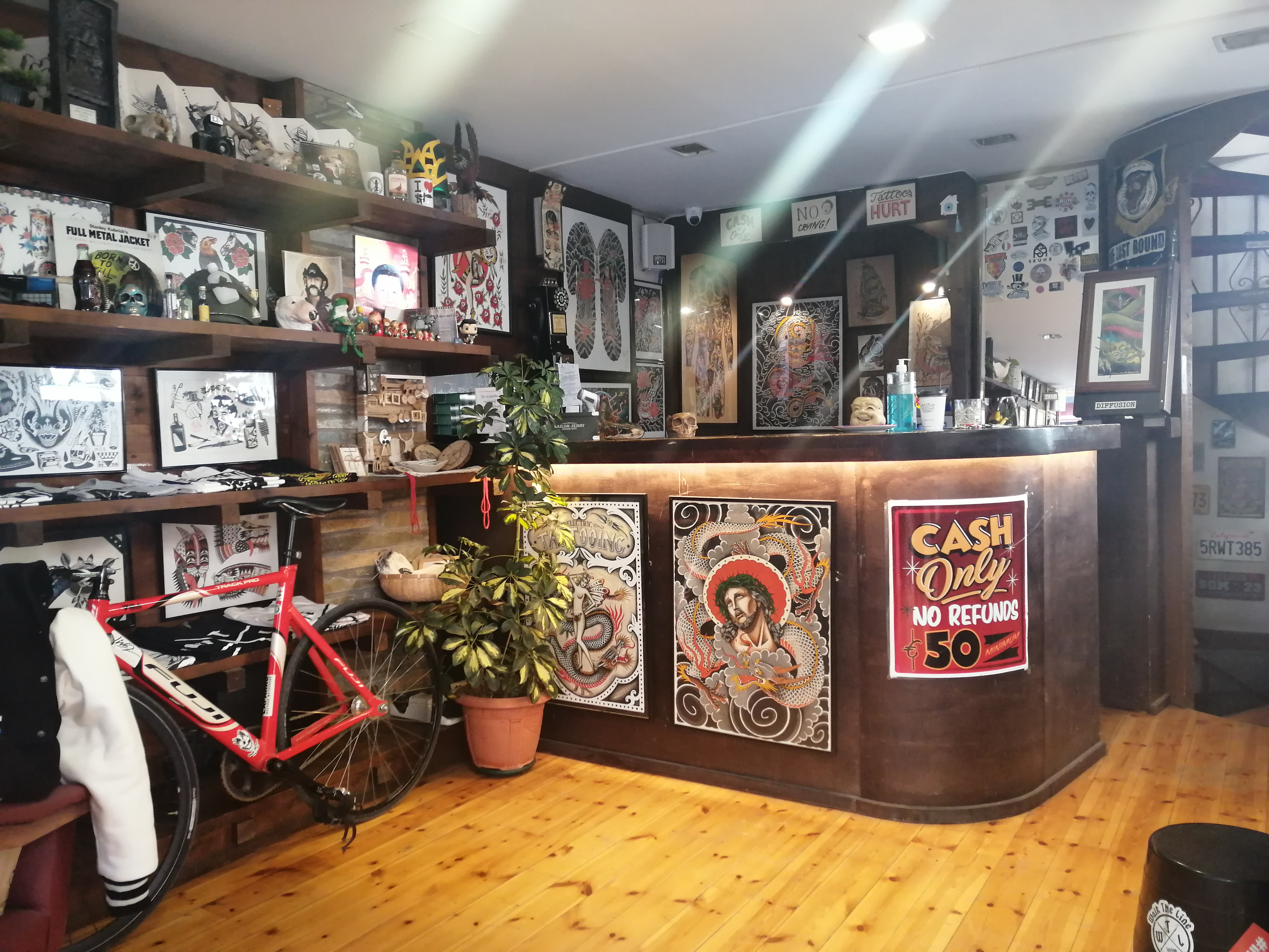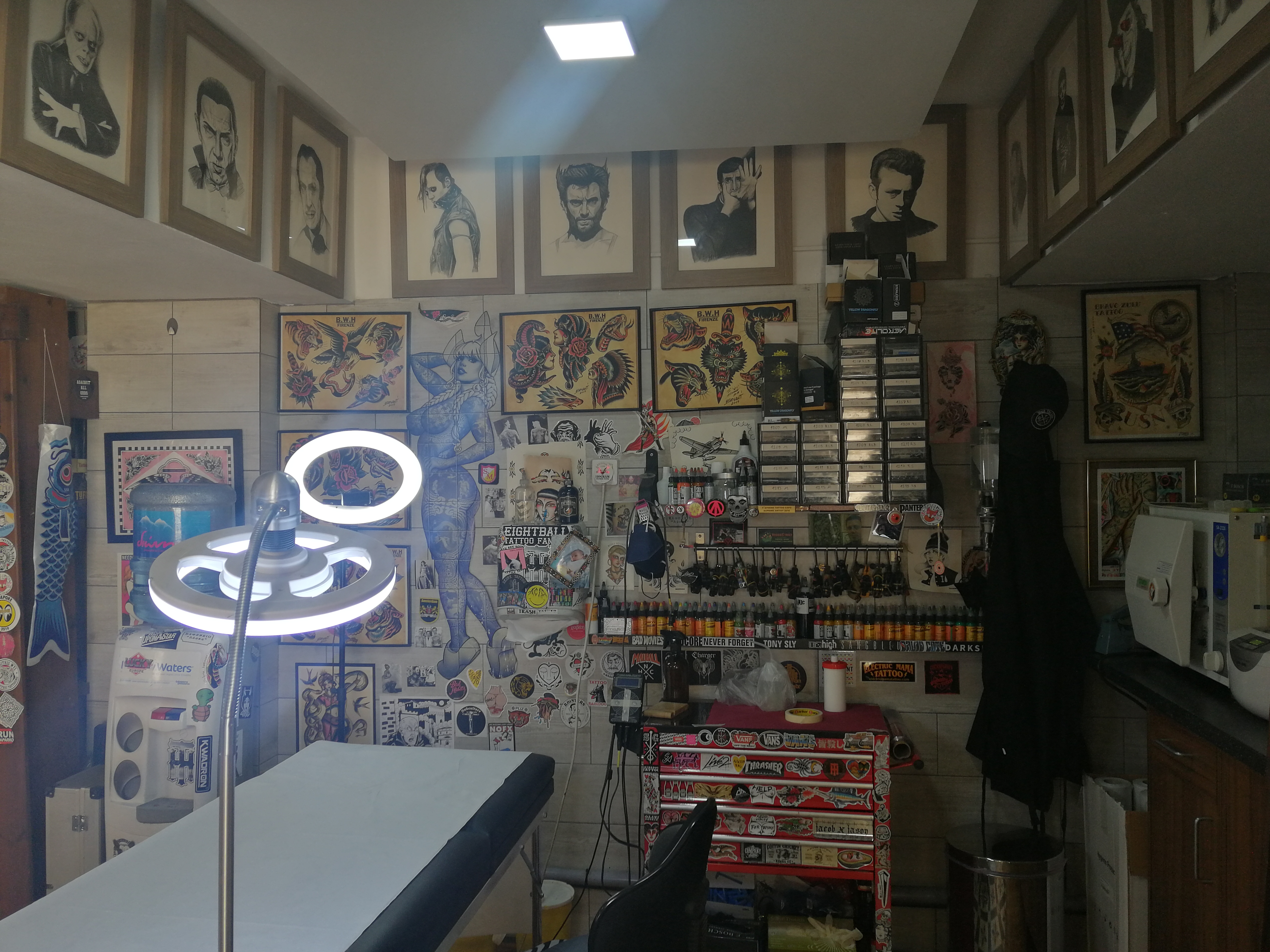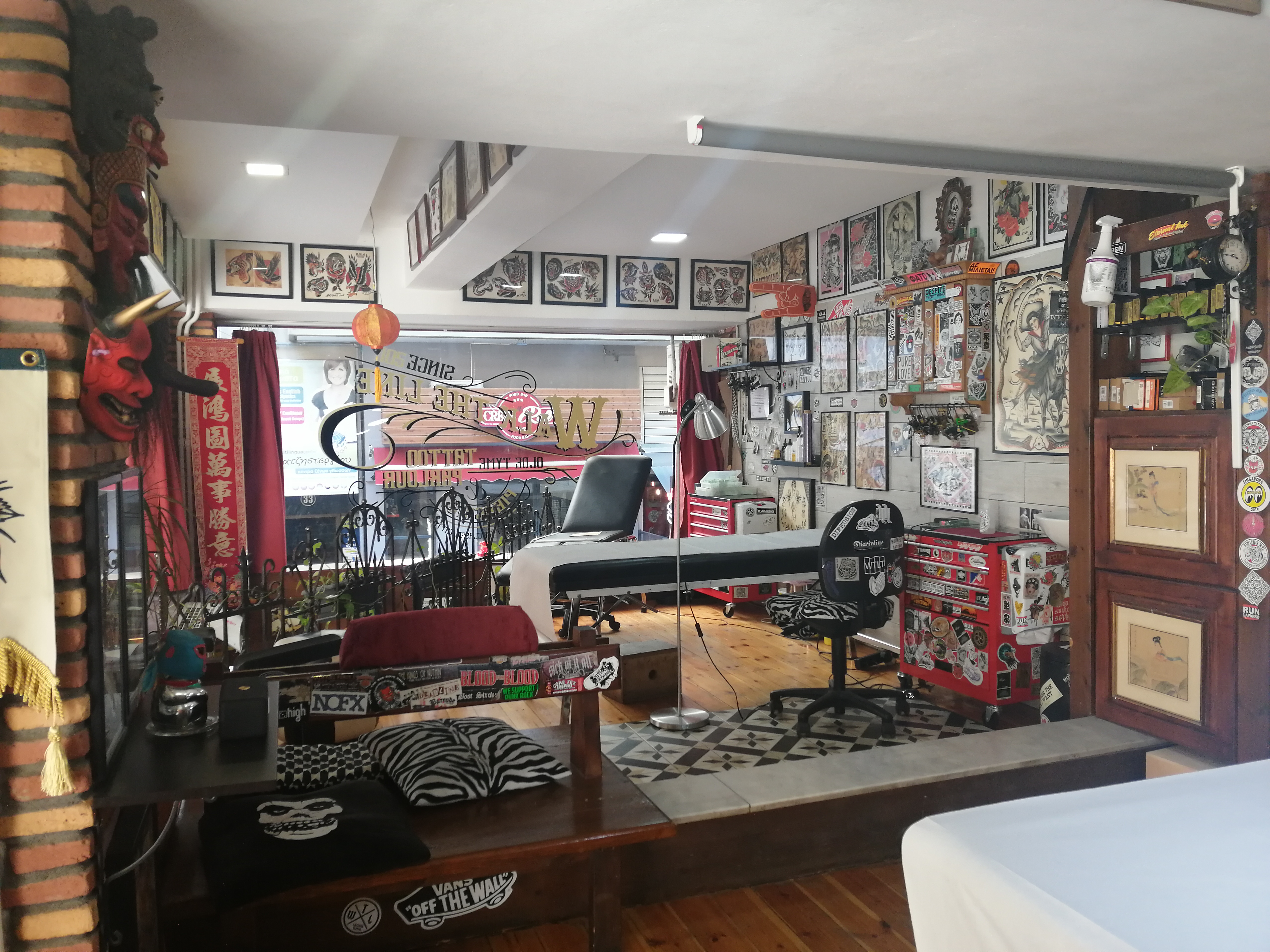 Ε, ναι. Δουλεύαμε από το ‘11 μέχρι το ‘13 μαζί στο tattoo, στο «Walk the Line», το οποίο βρισκόταν στην Ιουστινιανού, δουλεύαμε μέχρι το ’13 μαζί. Εγώ παράλληλα έκανα tattoo. Εκεί ο χώρος ήταν πάρα πολύ μικρός, χωρούσε ίσα ίσα ένα κρεβάτι, ίσα ίσα ένα κρεβάτι. Εγώ έκανα παράλληλα tattoo στο σπίτι και τον πρότεινα να μεταφερθούμε στο κέντρο και άνοιξα εγώ το μαγαζί εδώ στο κέντρο και τον πήρα κοντά και είμαστε πλέον συνέταιροι. Από το 2013.