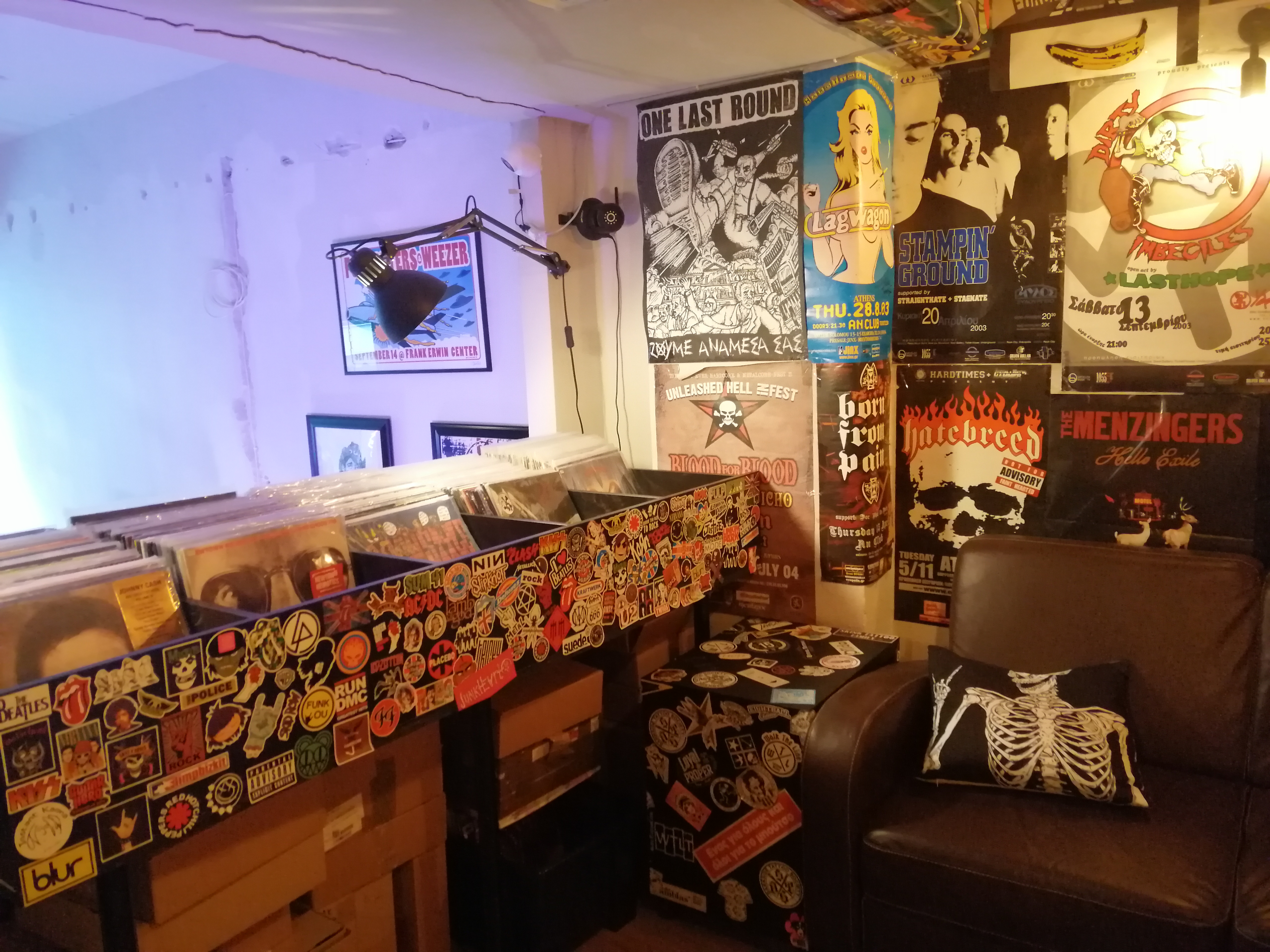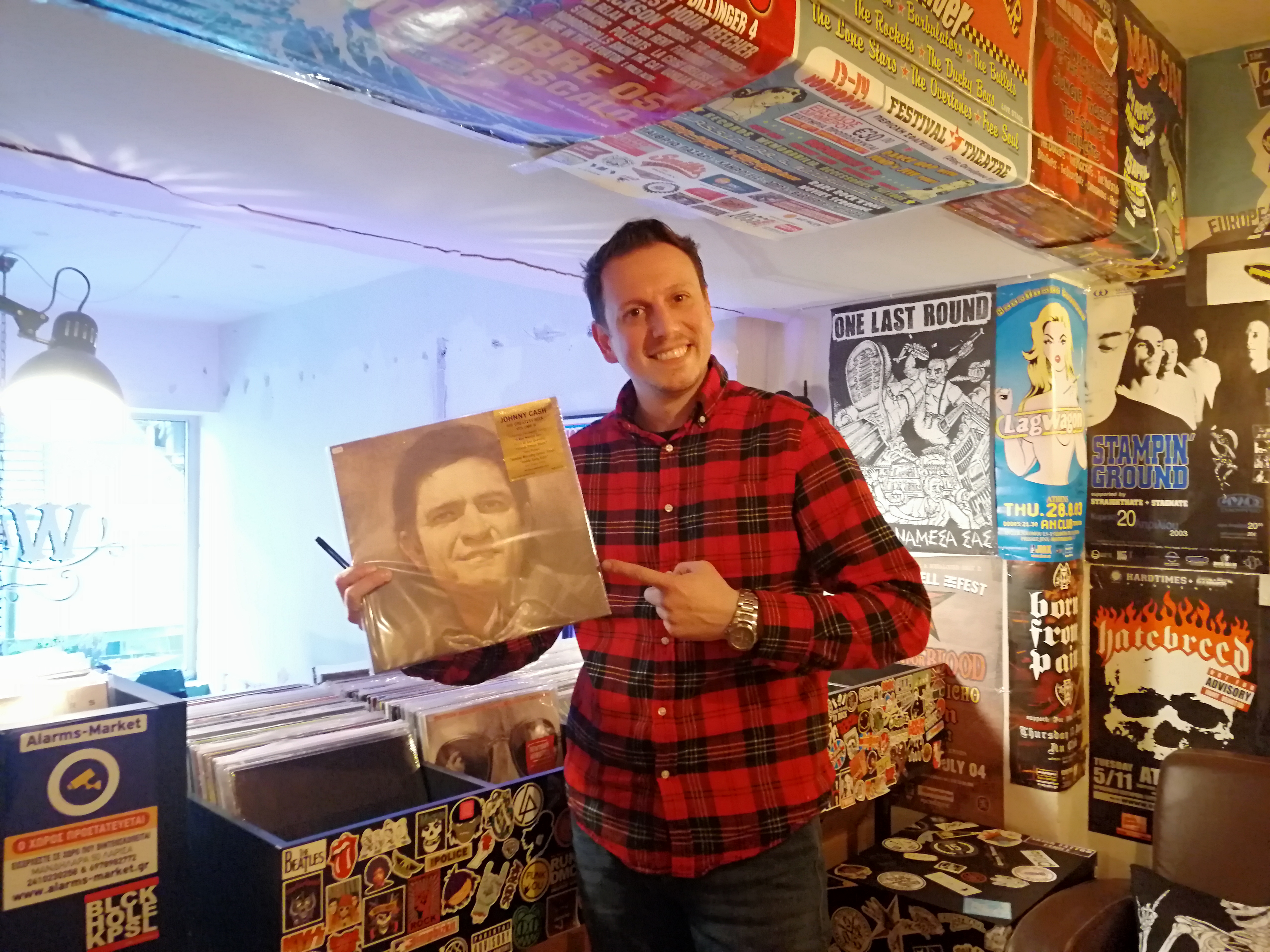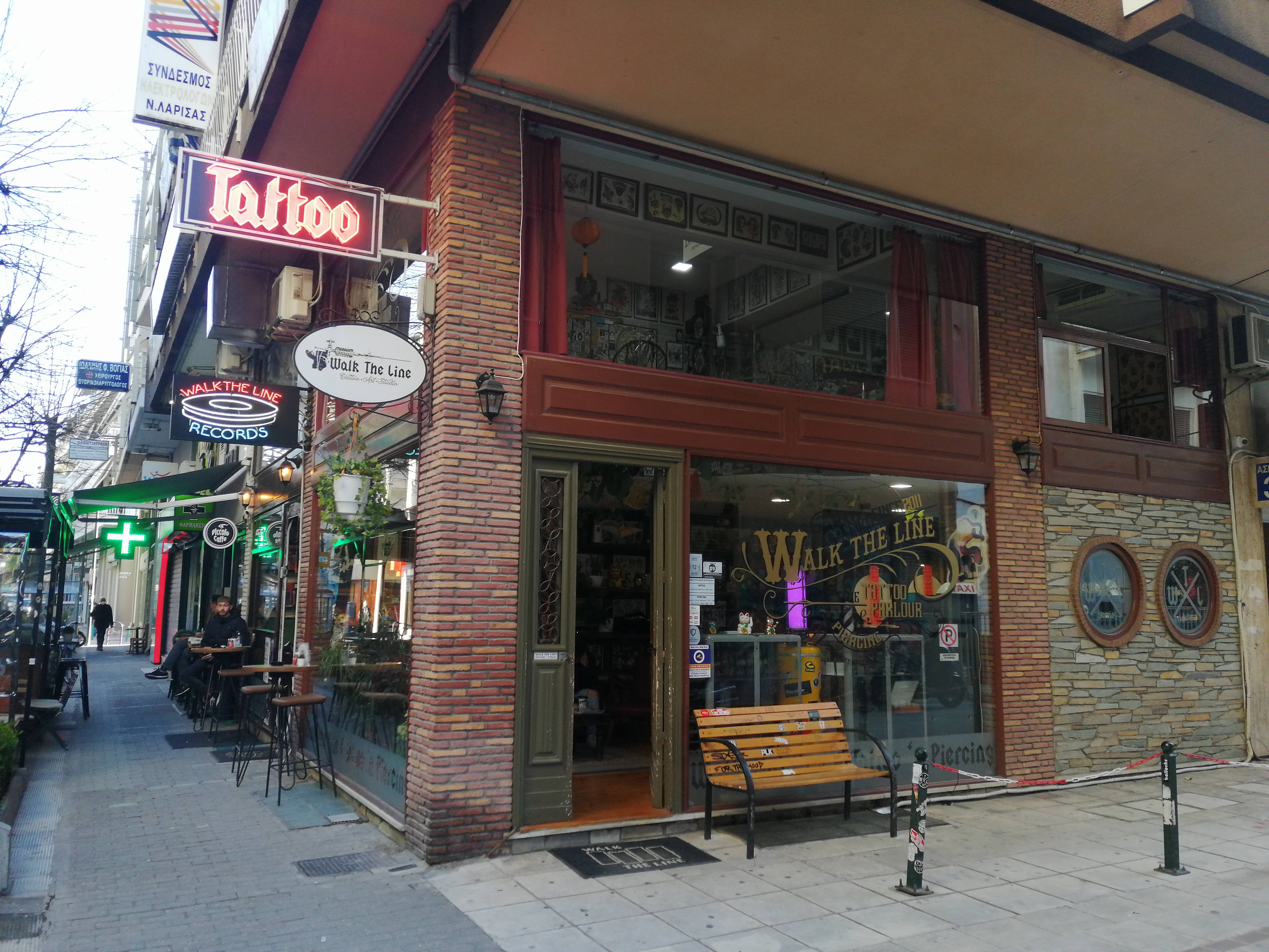 Ναι, έχουμε τον χώρο στο tattoo και έχουμε πάρει και τον χώρο δίπλα, το οποίο το έχουμε κάνει καφέ-δισκάδικο. Είναι μαζί δηλαδή σαν ίδιος χώρος, ίδια αισθητική έχει. Κάτω είναι το καφέ και πάνω είναι ένας μικρός χώρος, ο οποίος είναι record store και απευθύνεται πιο πολύ στο hardcore, punk, metal κοινό, να το πω έτσι, γιατί αυτή είναι η μουσική μου αρέσει και αυτοί είναι δίσκοι που φέρνω, να το πω έτσι. Πιο πολύ το κάναμε για χόμπι το δισκάδικο. Είναι κάτι το οποίο δεν κοιτάμε να βγάλουμε λεφτά από αυτό. Είναι καθαρά χομπίστικη φάση, να βοηθήσει και το καφέ, να τραβήξει λίγο κόσμο. Ανακυκλώνεται πιο πολύ το record store. Οι δίσκοι που φεύγουν. Με τα λεφτά από τους δίσκους που φεύγουν, αγοράζουμε καινούργιος δίσκος, παραγγέλνουμε καινούργιους δίσκους, και έχουμε κάνει και σαν record label, το οποίο έχουμε κυκλοφορήσει μουσική σαν «Walk the Line Records label». Και τώρα περιμένουμε να βγει ένας δίσκος από μία μπάντα τοπική που λέγονται «Ποιότητα». Παίζουν έτσι pop, skate-punk. Είναι φίλοι μου τα παιδιά και ήθελα να τους βγάλω τον δίσκο, να τους βγάλουμε τον δίσκο εδώ σαν «Walk the Line Records» και περιμένουμε να κυκλοφορήσει ο δίσκος αυτήν τη στιγμή. Και, γενικά, έχουμε βοηθήσει και άλλες μπάντες παραγγέλνοντας δίσκους σαν label να τους βοηθήσουμε να βγει ο δίσκος αγοράζοντας χονδρική, να πουλάμε, τέτοια πράγματα.