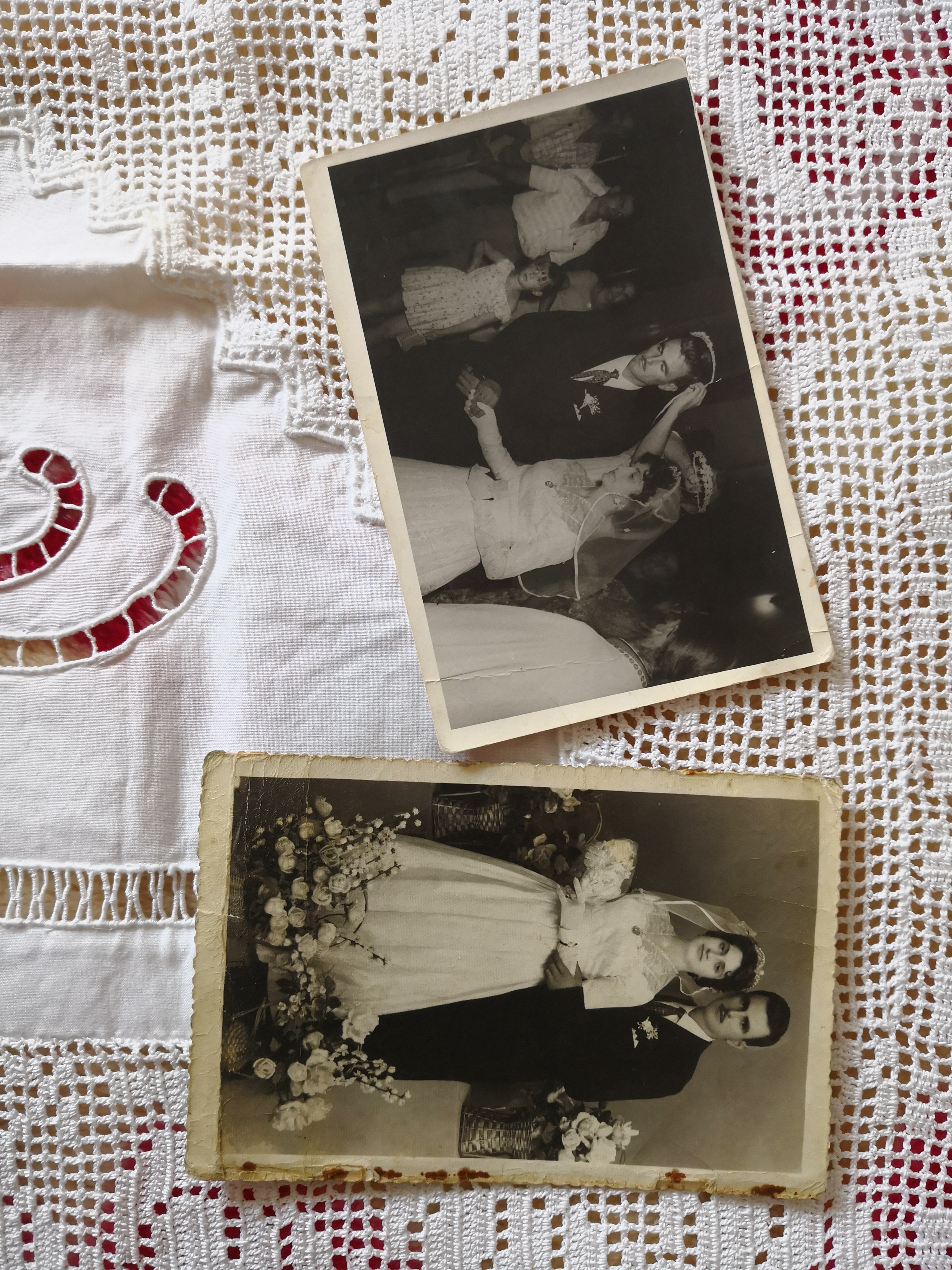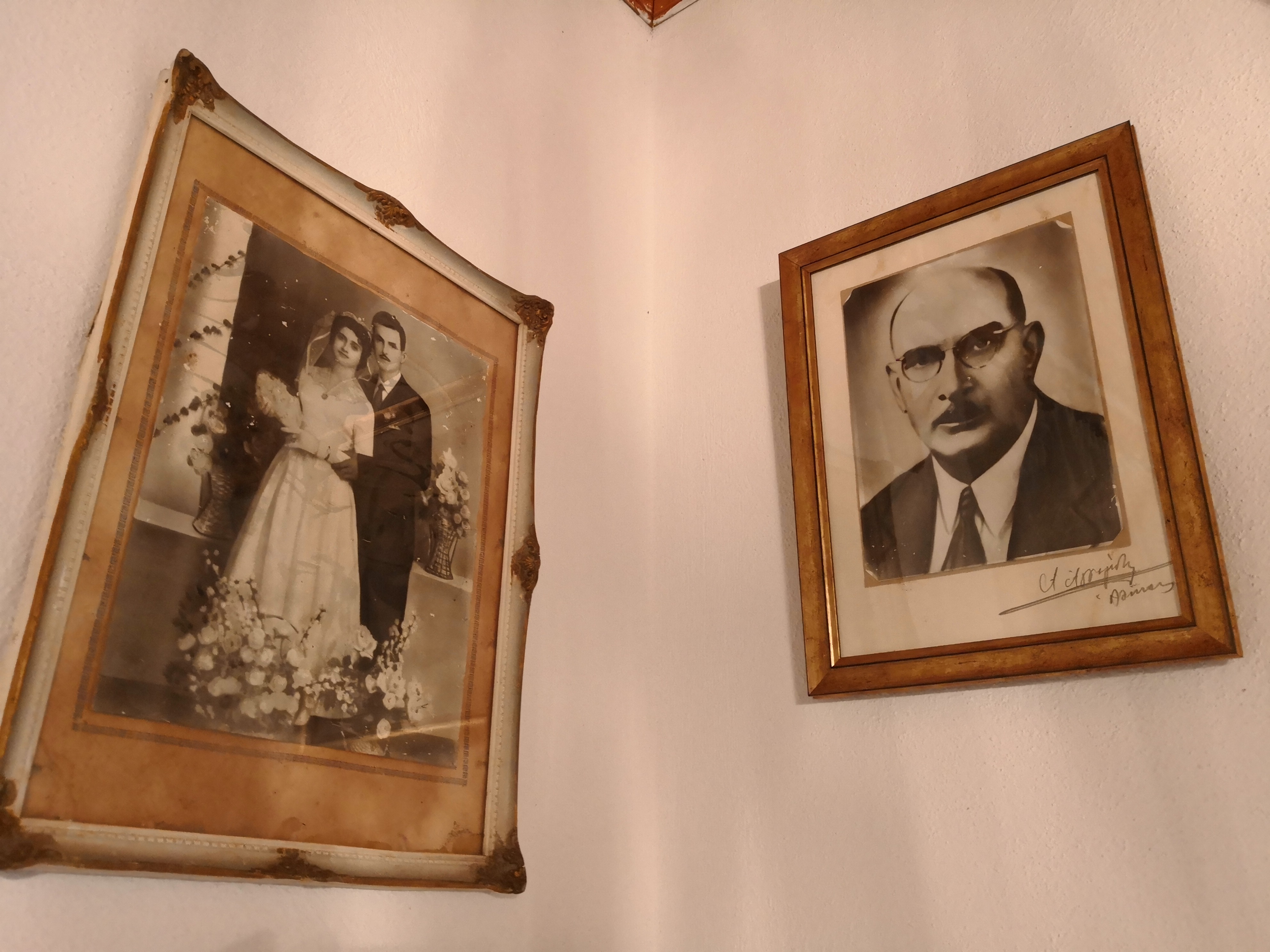 Και σ' αυτήν εδώ τη φωτογραφία είναι η μέρα του ημέρα του γάμου, ε; Η μέρα του γάμου, ναι, η μέρα που παντρευτήκαμε στην εκκλησία. Η μέρα τ…δεν μπορούσα εγώ να ξαναπάω εκεί πάνω, την πήρα. Λέω: «Είναι αμαρτία, θα χαλάσει εκεί απάνω στο σπίτι κλεισμένη» και την έφερα εδώ κι αυτή.