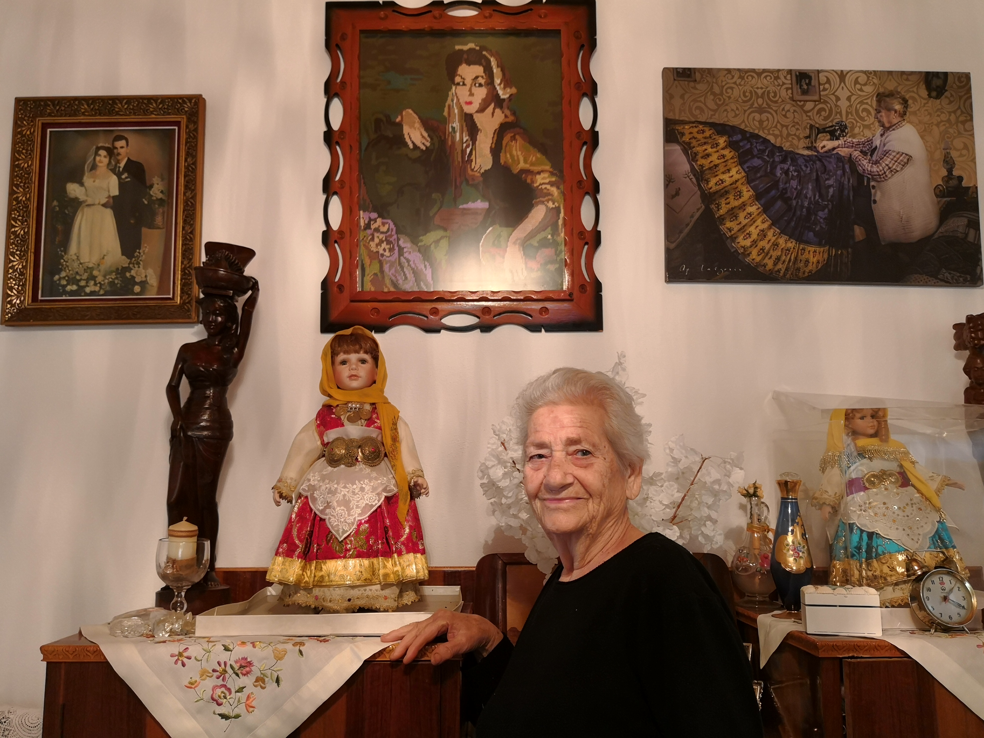 Ναι. Στις κούκλες, να σου πω. Το πουκάμισο αυτό που έχω στην κούκλα είναι της μάνας μου, που φορούσε την Πρωτομαγιά, που πήγαινε στην εκκλησία. Τα κλειδωτάρια είναι απ' την... Πες την, απάνω...