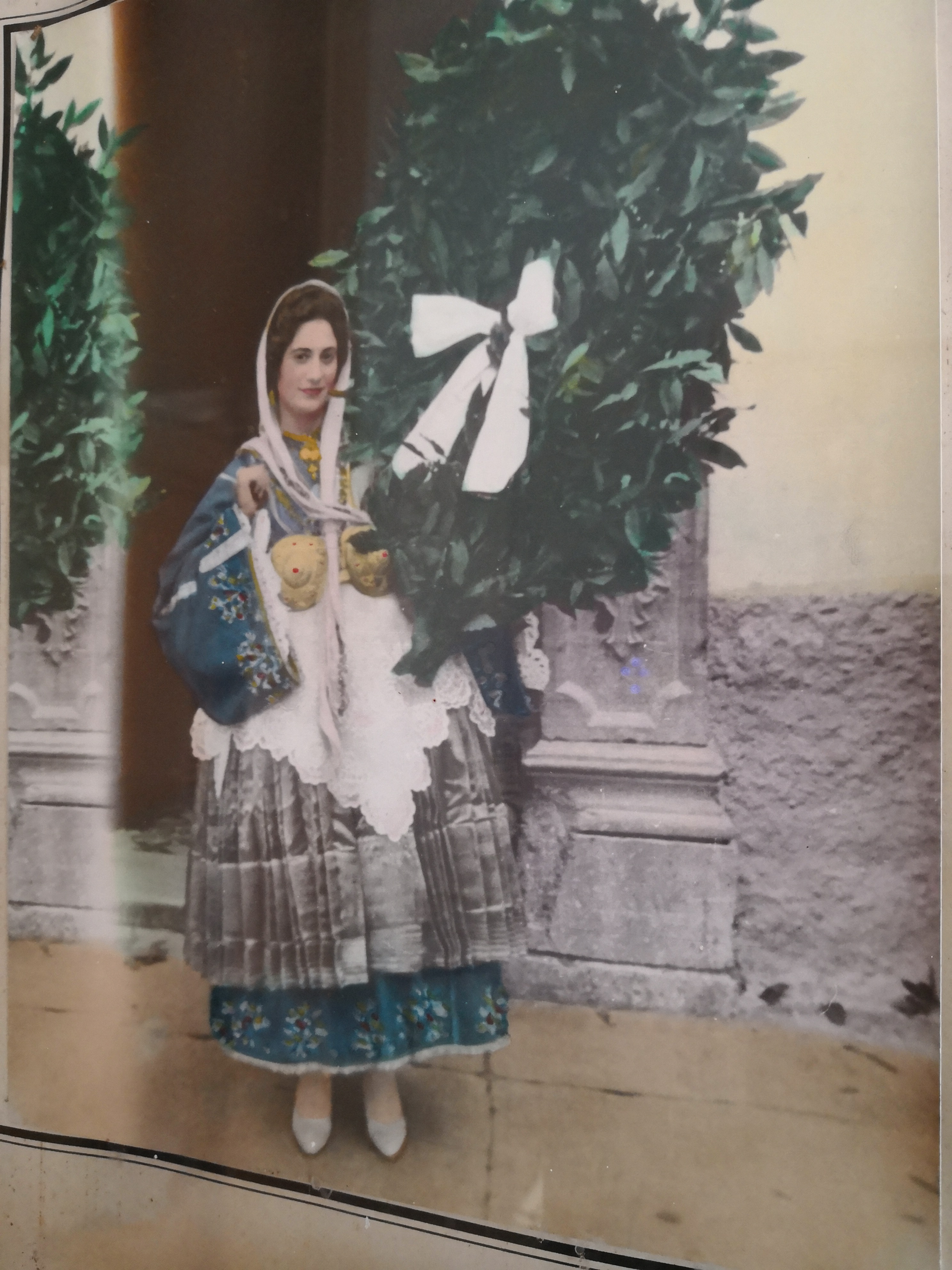 Όχι σαν πόδια, στο κλειδωτάρι δεν μπαίνει πόδια. Στο κλειδωτάρι μπαίνει ο τσεβρές, στην ποδιά δένει το άλλο το φουστάνι που δεν έχει ποδόγυρο, που είναι σκέτο. Στον ποδόγυρο μπαίνει ο τσεβρές και το κλειδωτάρι. Και το μαντήλι έτσι το έβαζαν εκείνα τα χρόνια, δεν τα βάζανε κάτω, το ένα το βάζανε στον λαιμό. Ο θείος ο Καραβαγγέλης; Αχ, ο θείος ο Καραβαγγέλης είναι ο δωρητής, όπως είπα προηγουμένως, τα δώρα που μας έκανε. Κι αυτόν τον έχω και στα ζώντα, και στα πεθαμένα, γραμμένο. Ναι. Και αυτή η φωτογραφία ήταν της μαμάς. Η μαμά με είχε βγάλει φωτογραφία και μετά αφού δεν μπορούσα εγώ να ξαναπάω εκεί πάνω, την πήρα. Λέω: «Είναι αμαρτία, θα χαλάσει εκεί απάνω στο σπίτι κλεισμένη» και την έφερα εδώ κι αυτή.